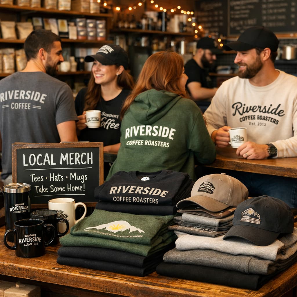 Branded merchandise can help tie that feeling together, both online and in the shop. Shelves feel more intentional. The space feels consistent. Regulars wear the connection beyond the counter, naturally extending your presence into everyday life. And for many shops, it also becomes a simple, steady way to support the business.